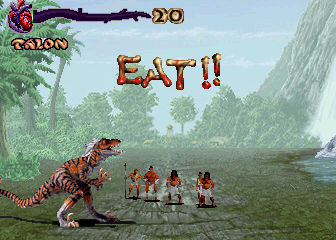 The kid picks the small, raptor-ish Talon to go up against the tyrannosauric Sauron, so the size difference between the human competitors and the dino combatants is comparable. It's the runt against Goliath. But it's not the size of the dog in the fight, as the saying goes. While this kid was a straight-up masher in Virtua Fighter, we learn that he has actually played Primal Rage before and at least knows enough about fighting games to understand the concept of "special moves".